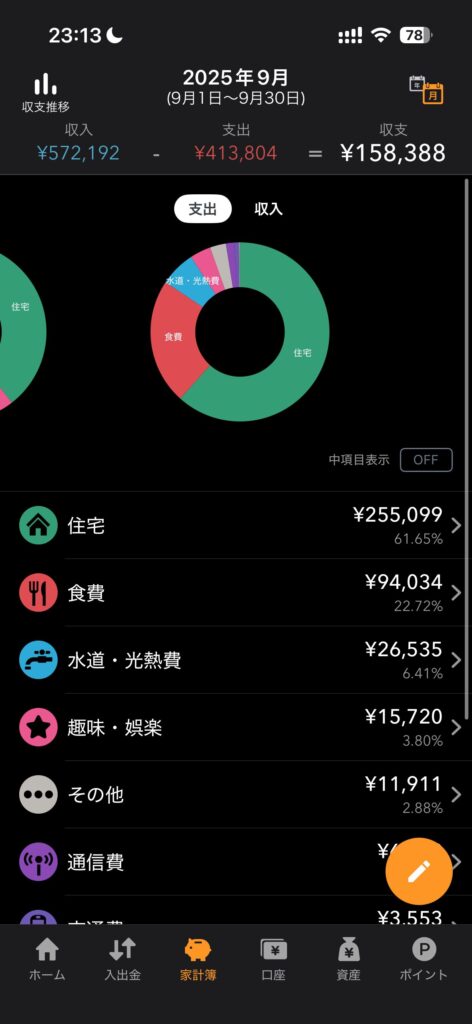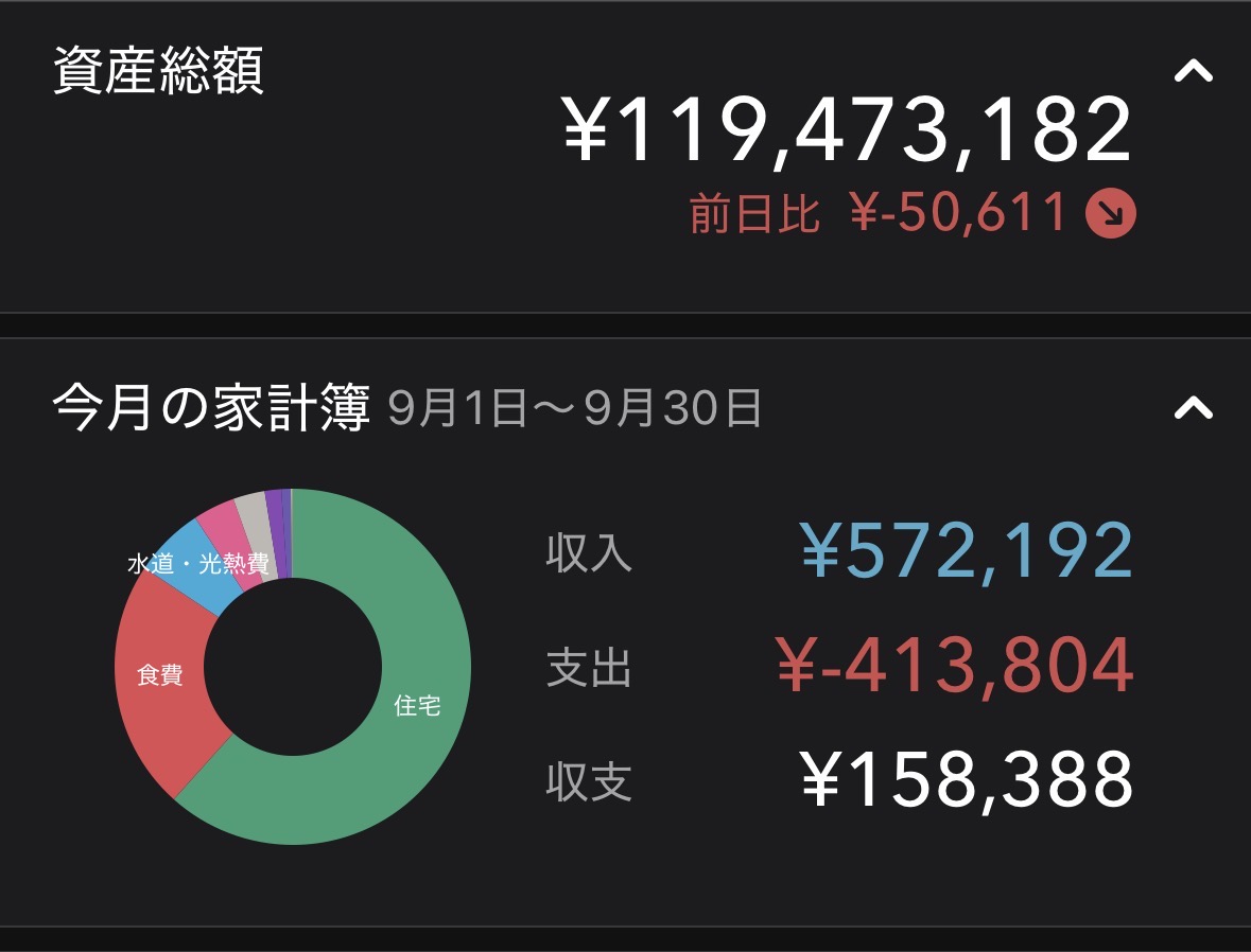 そのうち、流動支出として10月の旅行代で約1.5万円の計上です。今回は閉園間近の万博に連れて行く予定で、ホテルを予約したものが計上されました。最近は一泊でも家族4人で1.5万円に抑えられるのは本当に珍しく、今回はいい宿を予約できて節約になりました。