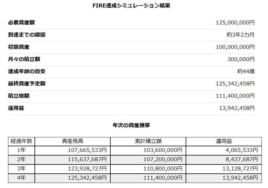 金融資産が1.2億円がありますが、FXスワップ分を除いた残り1億円の状態で、毎月30万円の追加投資をしながら利回り4%で400万円の生活費を賄おうとすると以下のとおりあと4年かかるようです。