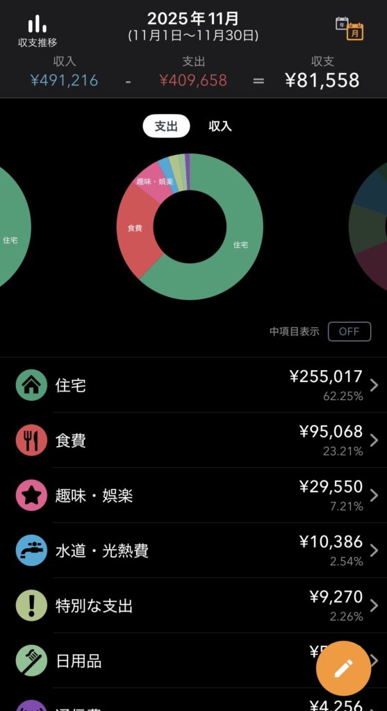 流動支出以外では、固定支出である食費が予算枠から5.5万円オーバー。9月から妻と食費の実態を調査しており、できるだけ夫アカウントで支払いをしています。子どもも大きくなったので、食費はどれくらいかかっているのか別途集計してみたいと思います。