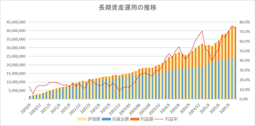一年で見ると上のグラフですが、このブログをつけ始めた2020年9月から見ると下図のとおりの右肩上がりです。ブレずに投資戦略を踏襲し、積立を主力として投資を継続していきます。