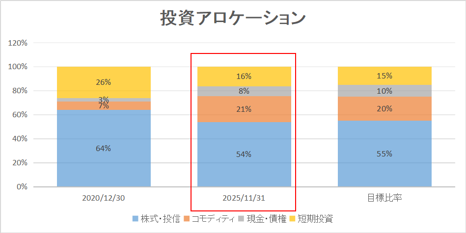 上図のとおり、仮想通貨が暴落したのでコモディティの割合が低下、債権の割合が少ないので、本来は仮想通貨を一部売却したいところですが、税制に旨味がないので、買いを続け、12月は債券に追加投資額を振ろうと考えています