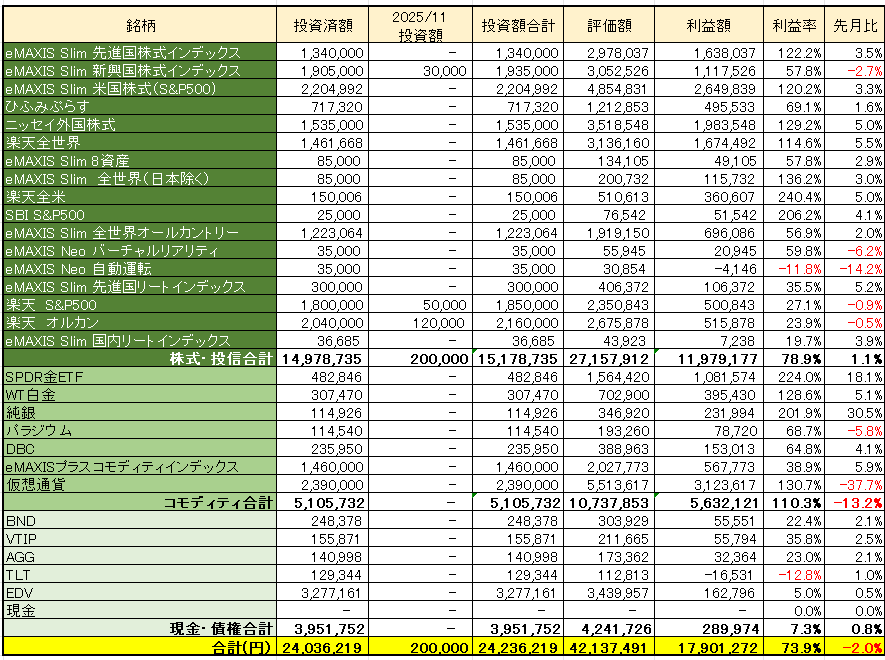 株式・投信関係は前月比で1.1%増、2025年からは毎月の積立は20万円になり、s&p500とオルカンと新興国インデックスにだけ投資している状況です。今月は米国株を中心に行ってこいでしたが、追加投資した銘柄だけ前月比マイナス、こんな時もあるので仕方ないです。先月調子が良かった新興国も反落、いつになったら新興国の時代が来るのだろうか。今が安値と思って積立していきます。