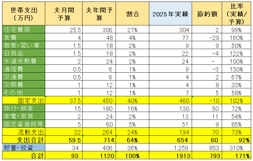 2025年では、固定支出は対予算で10万円超過しているものの、オーバーした内容を見ますと、主に食費です。9月から妻との貸し借り上、夫の方で食費を多く負担するようにして、ついでに食費のレベルを把握することにしました。